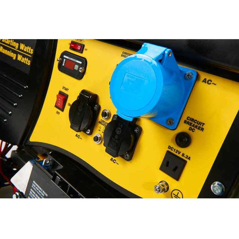 Champion Power Equipment CPG9000E2 pārnēsājamo elektriskā palaišanas benzīna ģeneratoru darbina Euro 5, 15ZS, 459cc Champion viena cilindra, 4-taktu OHV dzinējs, kas ražo 7500 darba vatus un 9375 palaišanas vatus.