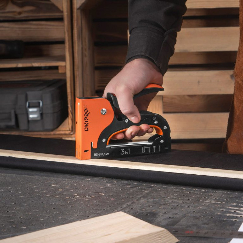 Celtniecības skavotājs Dnipro-M BS-614 / 3M ir paredzēts virsmu līmēšanai, ātrai polsterēšanai vai mēbeļu remontam.