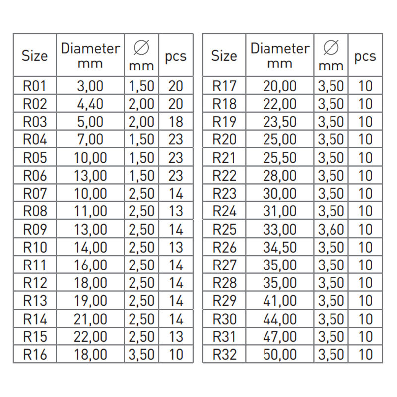 izmērs: 10 x 1.5 mm; 10 x 2.5 mm; 11 × 2.5 mm; 13 x 1.5 mm; 13 x 2.5 mm; 14 x 2.5 mm; 16 x 2.5 mm; 18 x 3.5 mm; 18 × 2.5 mm; 19 x 2.5 mm; 20 x 3.5 mm; 21 x 2.5 mm; 22 x 2.5 mm; 22 x 3.5 mm; 23.5 x 3.5 mm; 3 x 1.5 mm; 4.4 x 2 mm; 5 x 2 mm; 7 x 1.5 mm