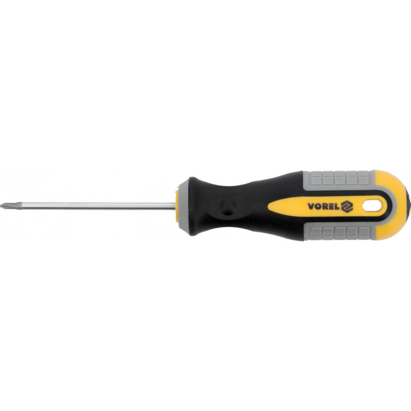 Krusta skrūvgriezis PH00x65 mm no Vorel 60920. Izgatavots no CrV hroma-vanādija tērauda. Galva ir ar satīna apdari, papildus smilšpapīrēta un magnētiska, kas nodrošina drošu skrūves turēšanu. Rokturi veidoti no divām kompozītmateriālu plastmasām. Roktura caurums ļauj skrūvgriezi pakārt. Indekss: 60920