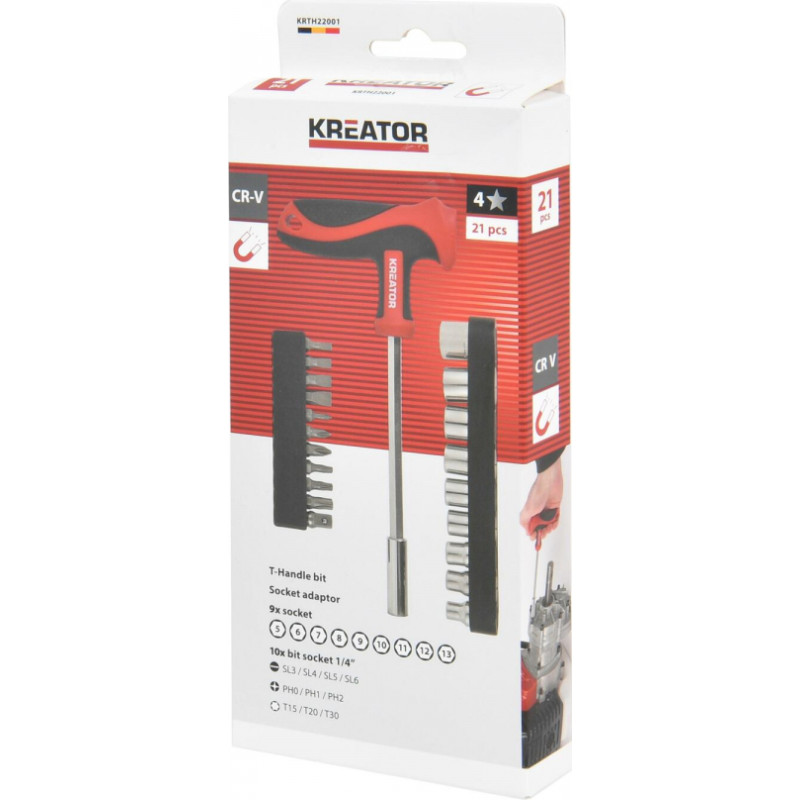 Kreator T-veida rokturis ar uzgaļiem un muciņu atslēgām 1/4 21gab KREATOR KRTH22001