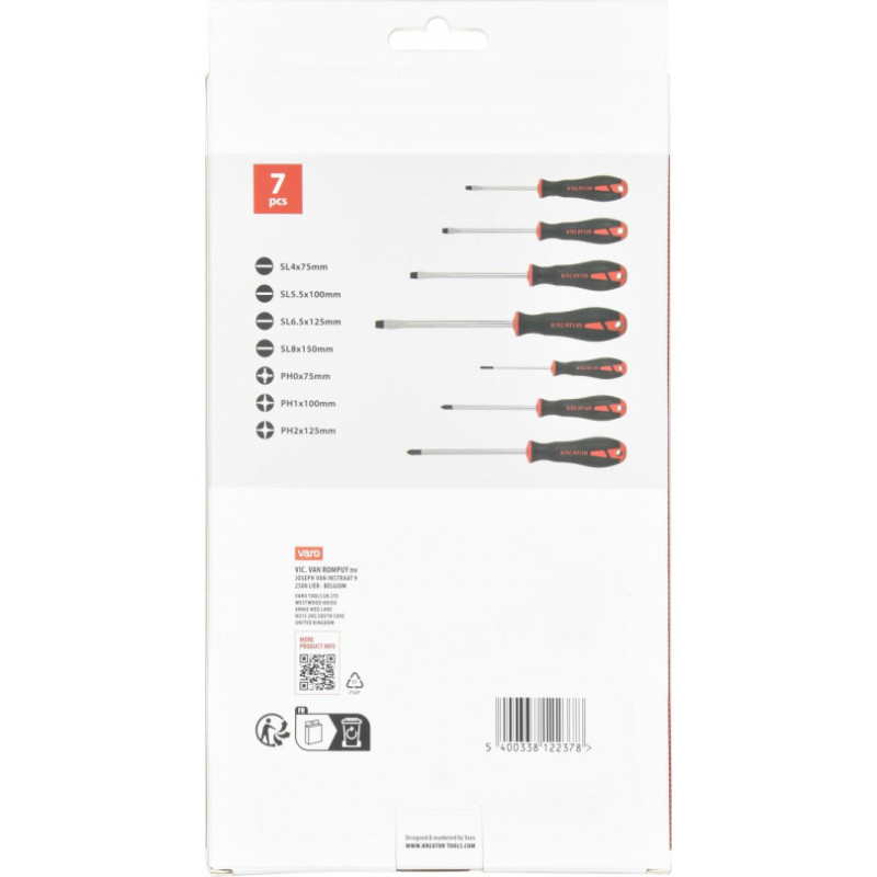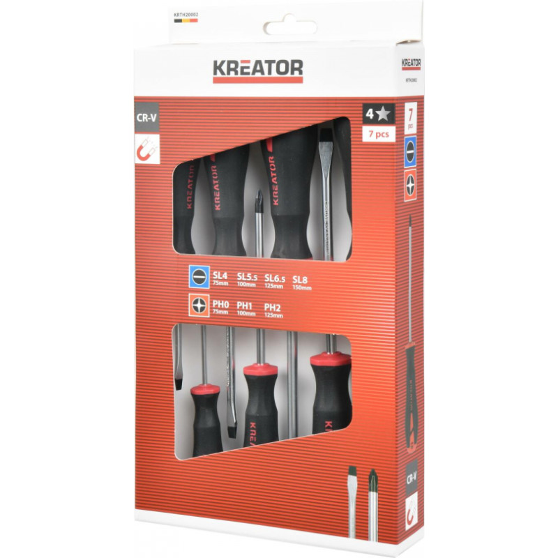 KREATOR skrūvgriežu komplekts ar kodu KRTH20002 ietver 7 hromvanādija skrūvgriežus ar magnētiskajiem galiem, kas garantē vieglu skrūvju montāžu. Komplektā ietilpst gan plaknainie, gan PH skrūvgrieži, un tas nodrošina lielisku saķeri pateicoties mīkstajam pret-slīdēšanas rokturim.