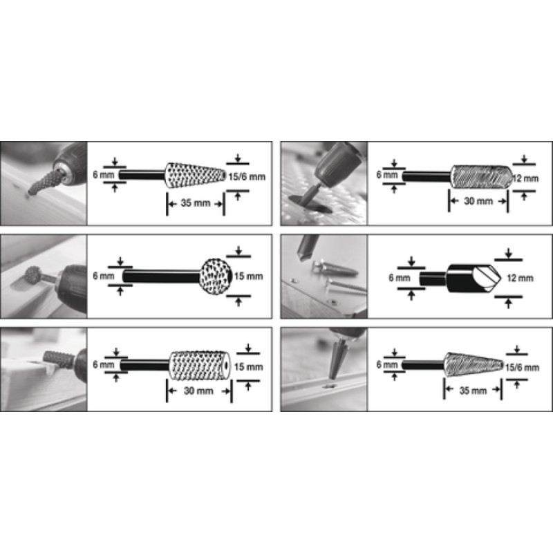 6 frēzes komplekts, kas paredzēts tērauda, alumīnija un koka apstrādei. Precīza izpilde no augstas kvalitātes HSS ātrgriežu tērauda nodrošina izcilu materiāla apstrādes kvalitāti un ātrumu.