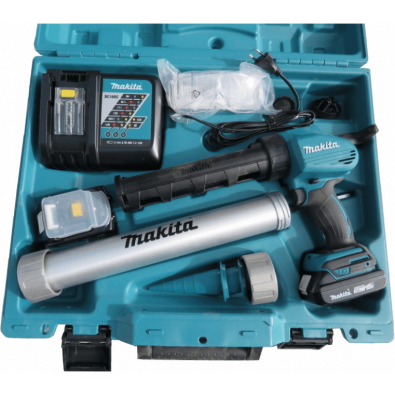 Ātruma regulēšana. Automātiska spiediena izlaišana, atlaižot slēdzi. Elektroniskā aizsardzība pret pārslodzi. Darba gaismas diode. Ar 3,0 Ah akumulatoru līdz 500 gab. 300 ml silikona iepakojumu.