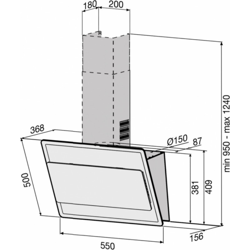 - stiprināms pie sienas -- stikla priekšējais panelis - saderīgs ar DC tipa ventilatoriem (maks. 260 W) - apgaismots skārienvadības panelis - taimeris - ziemas starta funkcija - nominālā apgaismojuma jauda 5 W, 2 x LED (3000 K) - mazgājams metāla filtrs - perimetra gaisa savākšana - atgādinājums par filtra tīrīšanu - kanāla diametrs 150/125 mm - 550 x 368 x 409 mm (platums x dziļums x augstums) - tvaika nosūcējs + pieslēguma dekoratīvais aizsegs ar nerūsējošā tērauda apdari 950-1240 mm Rekomendējamie DC tipa ventilatoru modeļi: Vilpe E-190, 220
