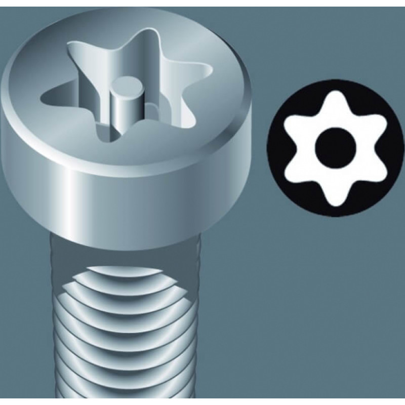 TORX® ar izurbtu caurumu. Izturīgs, elastīgs, ideāli piemērots skrūvēšanai metāla loksnē vai metāla konstrukcijā.